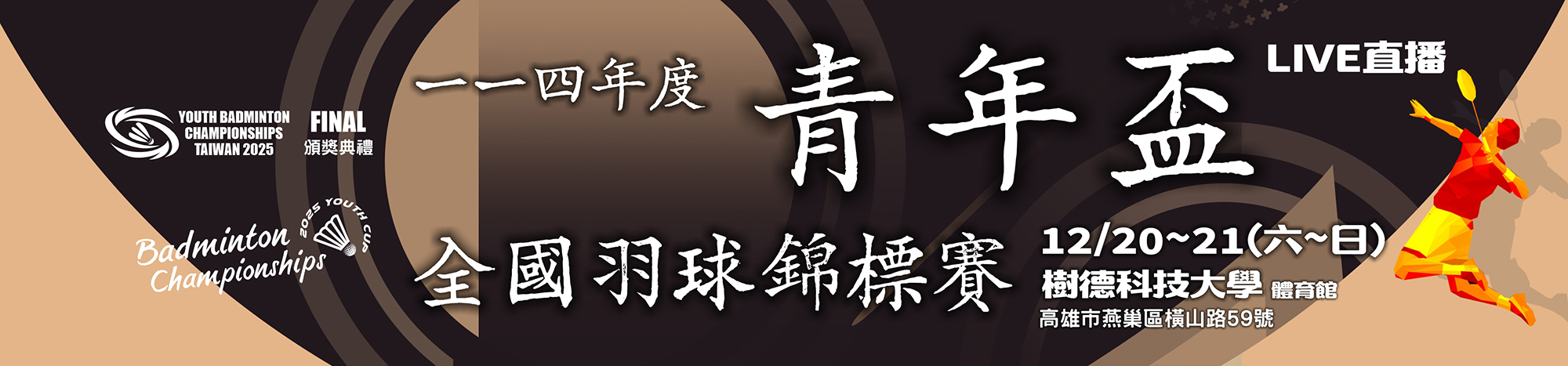 最新消息| [國內賽事] 114年度青年盃全國羽球錦標賽暨2025全國青少年羽球錦標賽年度總決賽 開始受理報名 報名至11/17 | 2025-10-21 | |