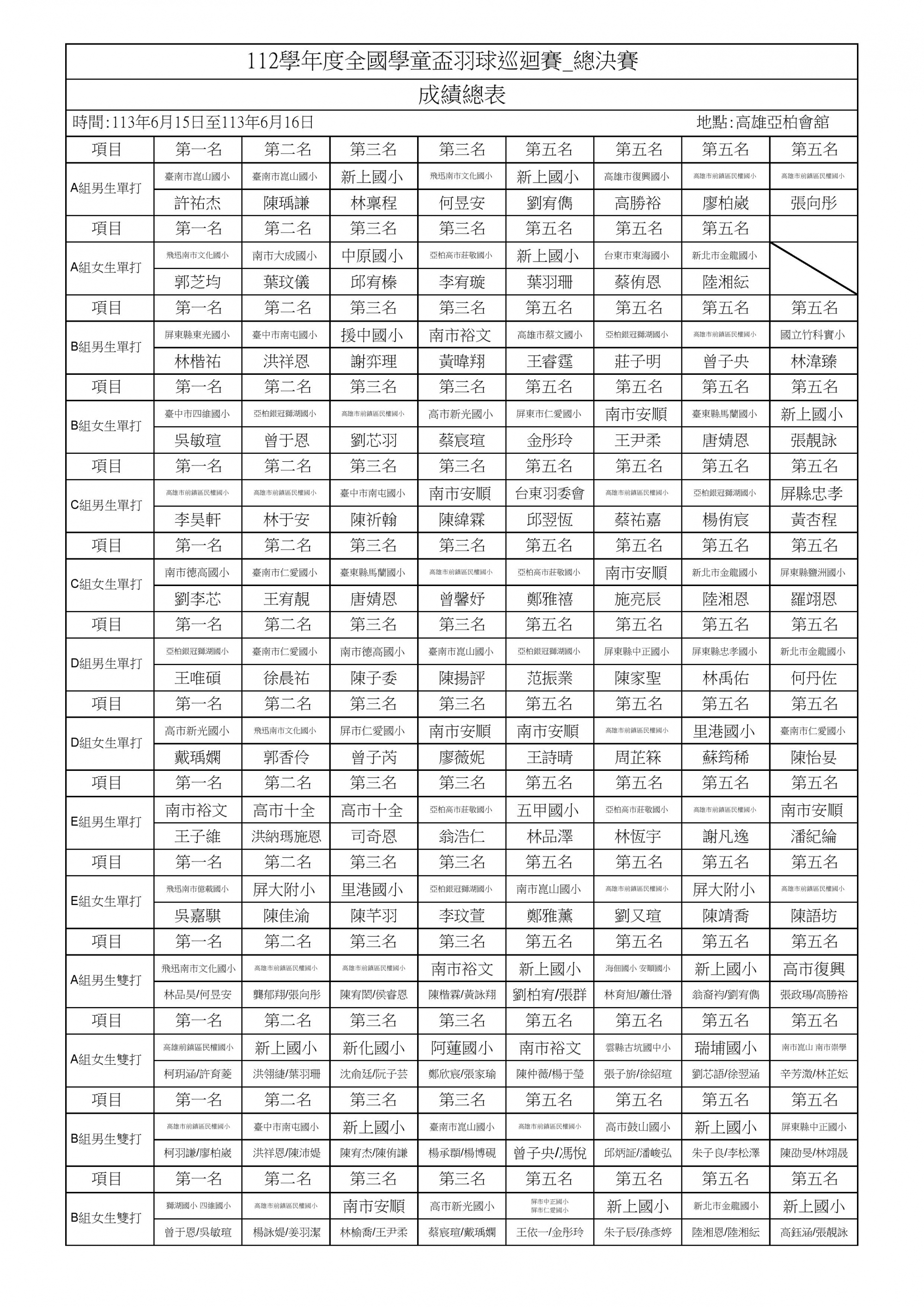 A級(六年級組)男生雙打 積分排名