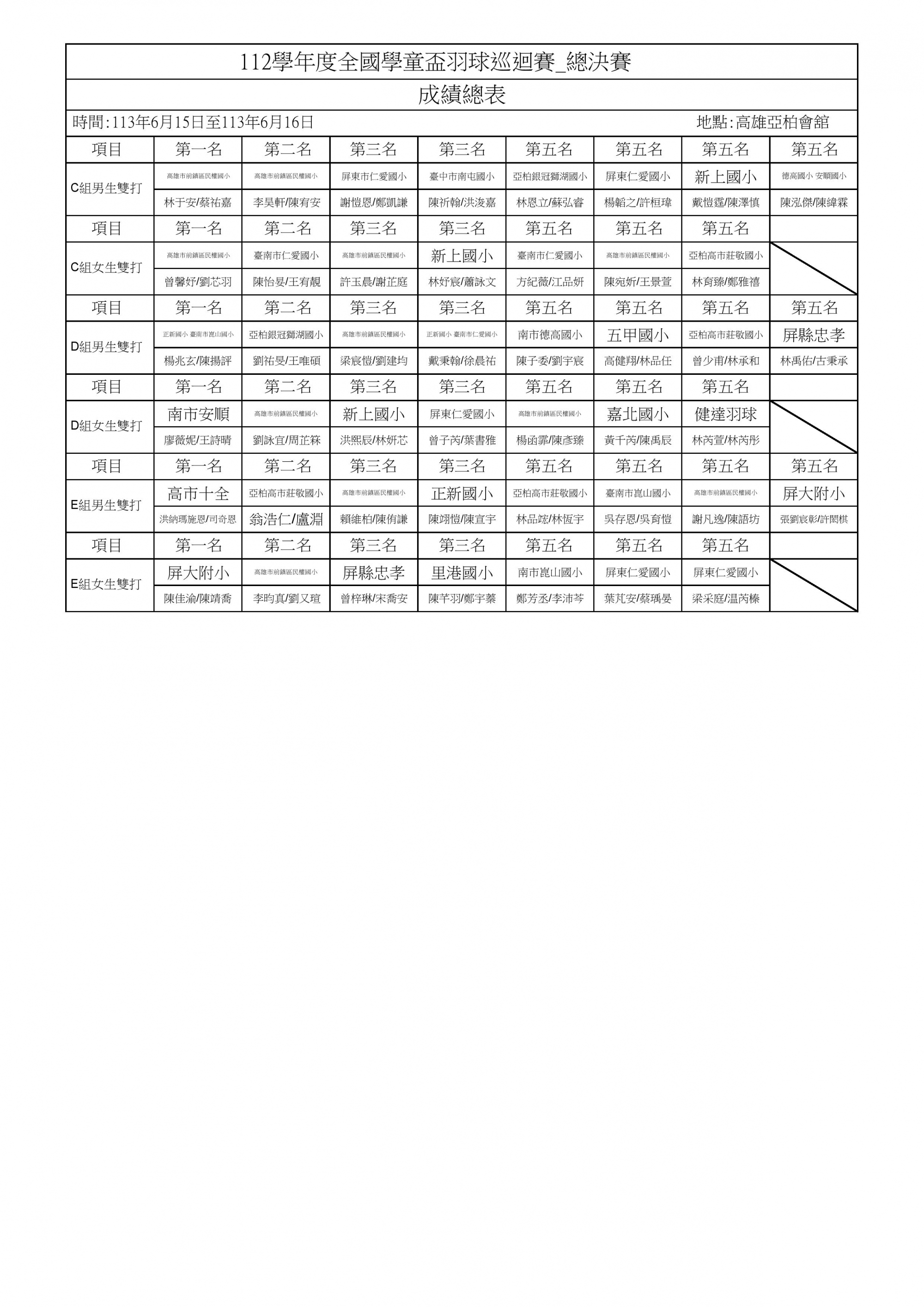 E級(低年級組)男生雙打 積分排名