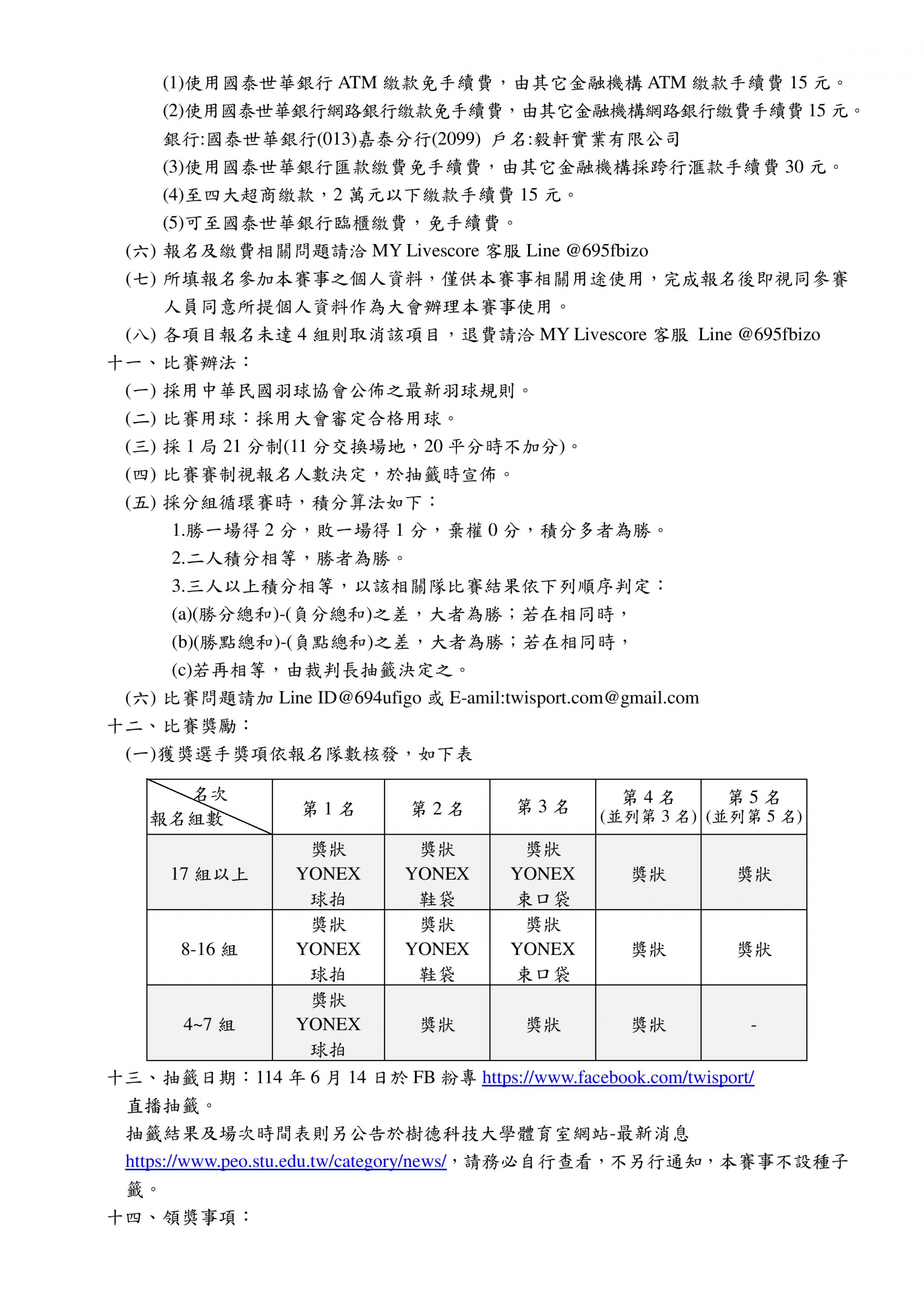 已報名「114年度菁英盃全國羽球錦標賽」者亦可報名,賽程不衝突