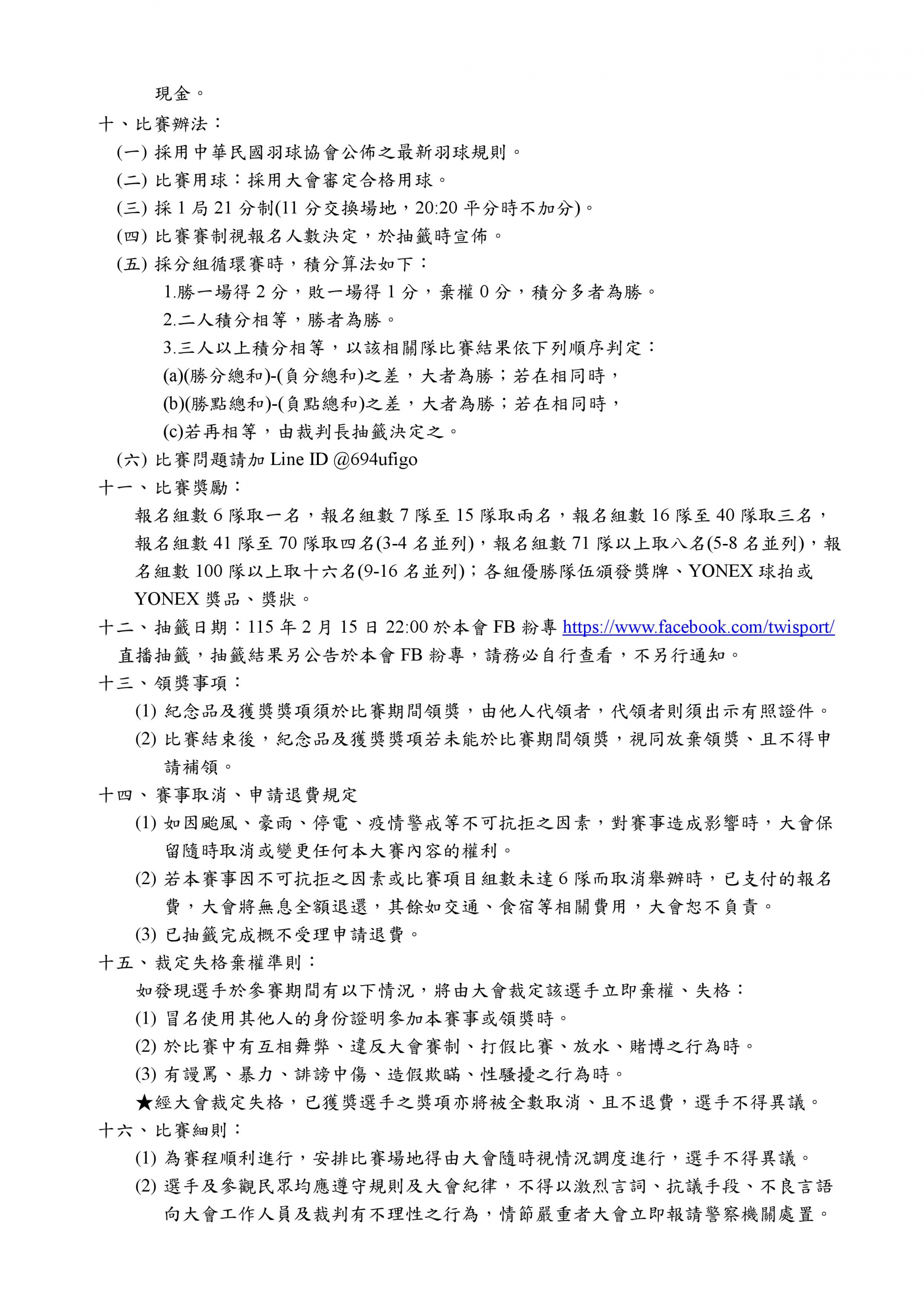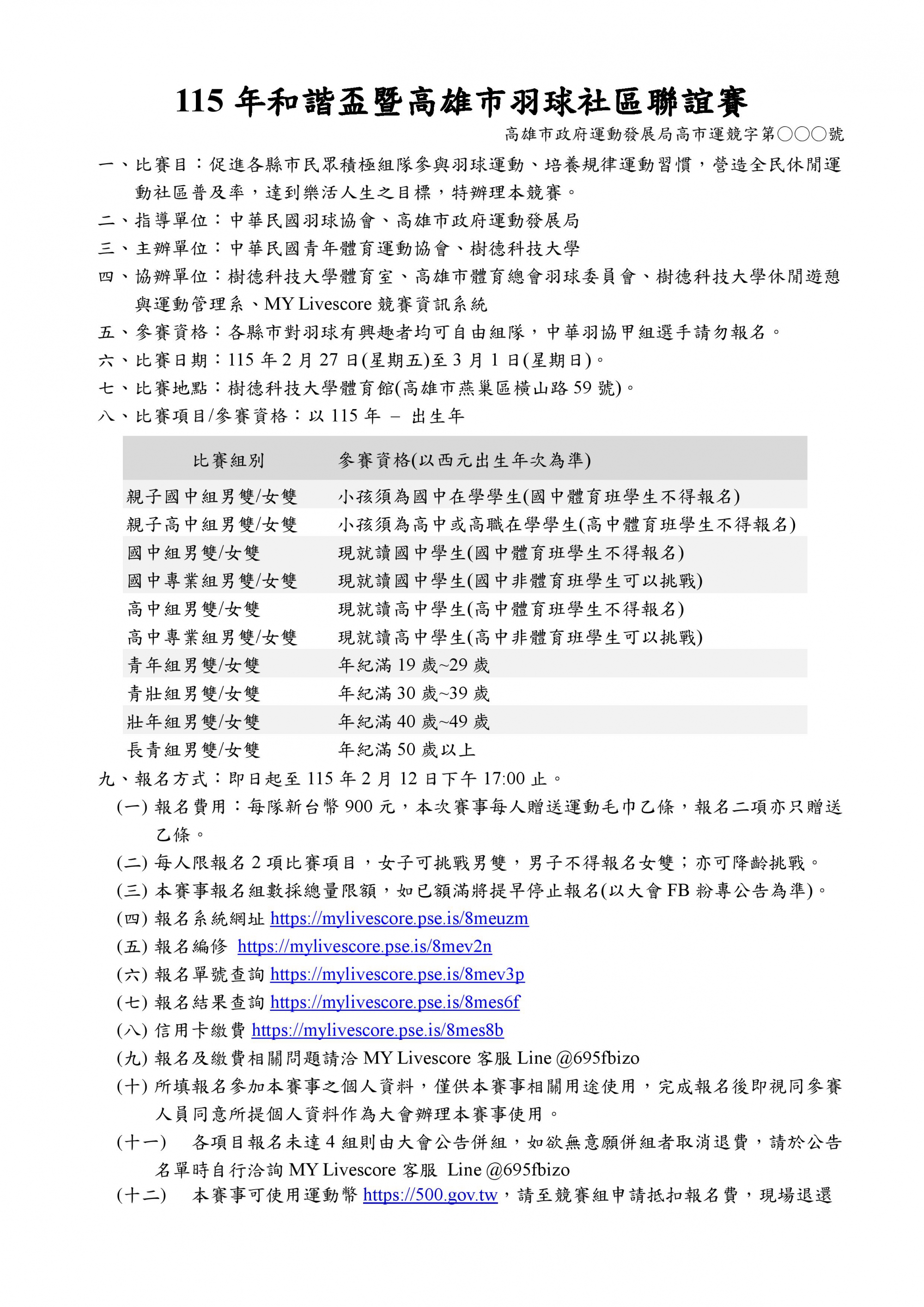 115年和諧盃暨高雄市羽球社區聯誼賽開始報名嘍
